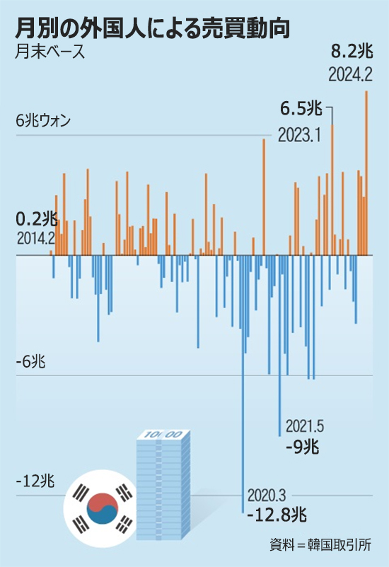 今年2月、外国人投資家は韓国株式市場で8兆ウォン以上を買い越した。月別で過去最大規模だ。これまでは2013年9月の7兆8263億ウォンが最大だった。