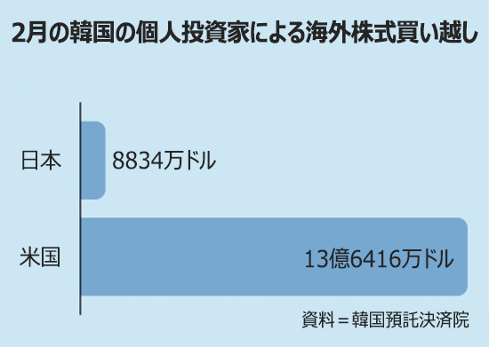 個人投資家は韓国株式市場から引き出した資金を米国や日本の株式に移動させている。韓国預託決済院によると、28日までの2月の1カ月間で韓国の投資家による米国株買い越しは約1兆8200億ウォン規模で、1月に比べ87%増えた。日本株に対する買い越しは約1180億ウォンで、1月よりも10%減少したが、昨年2月に約237億ウォンを売り越したのとは異なり、今年は買い越しが続いている。