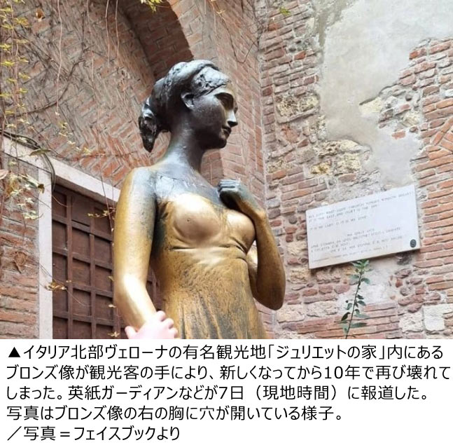 ジュリエット像はヴェローナの有名観光スポットで、胸を触ろうと毎日、観光客が数百人集まる。現地メディアによると、観光客の手のひらの汗で穴が開いたものとみられるそうだ。