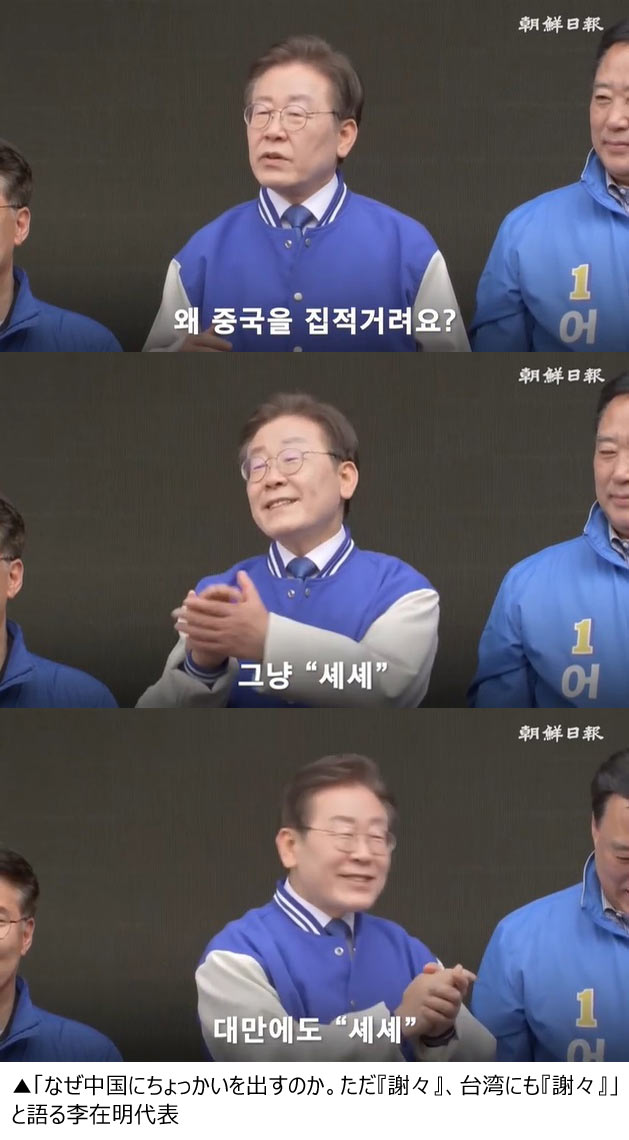 「謝謝」発言の李在明代表は「今回の総選挙は(親日政権を審判する)韓日戦」だとも語った。落ち着いてもらいたい、外国勢力を巻き込んでいたら大変なことになる。選挙は韓国語で行うものなのだから。