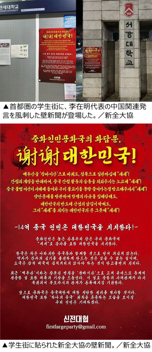 韓国の新全国大学生代表者協議会(以下、新全大協)は1日、李代表の母校である中央大(韓国)をはじめソウル大、延世大、西江大、建国大などのキャンパス周辺に「中華人民共和国の返答文、謝謝大韓民国」と題する壁新聞を貼ったことを明らかにした。新全大協の関係者は「両岸問題(中国と台湾の問題)を傍観し、航海の自由を侵害されても、大韓民国の半導体産業の前途を阻まれても、ただ謝謝と叫ぶ大韓民国に、中国は感謝を表すほかないのではないだろうか」と話した。