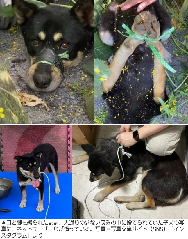 【NEWSIS】口と脚が縛られたまま、人通りの少ない茂みの中に捨てられていた子犬の写真がインターネット上で拡散され、ネットユーザーたちが激怒している。
