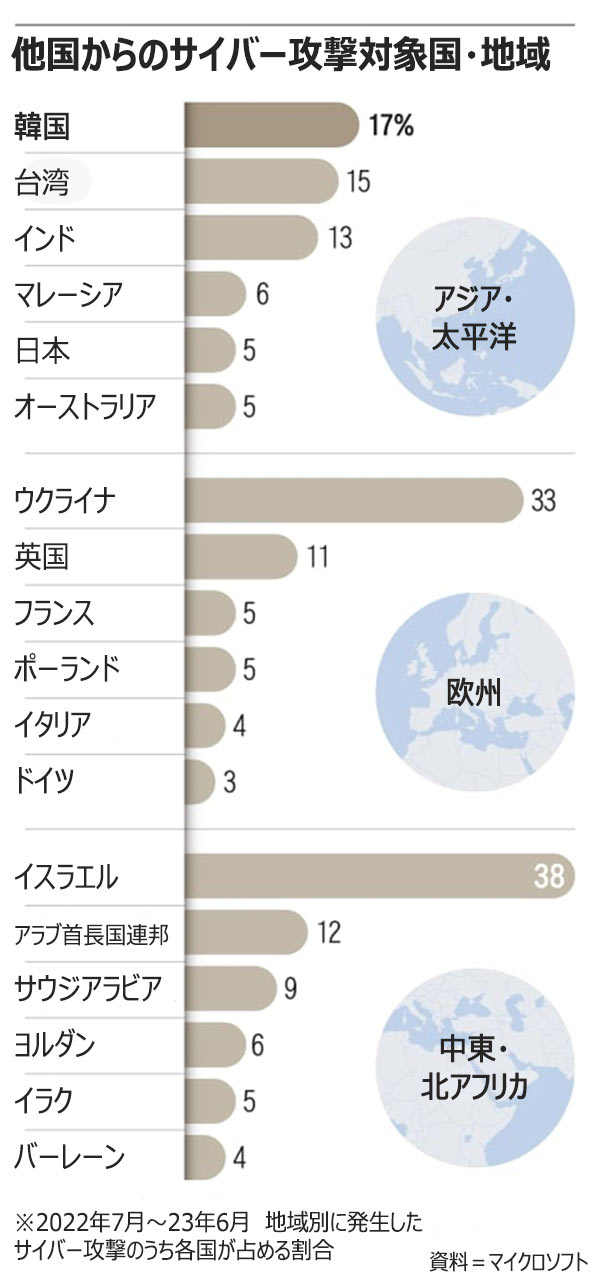 ソーシャルメディア活動が活発で政治的対立が激しい韓国は、こうした国外からのサイバー攻撃に特に脆弱だ。MSが昨年10月に発表した「デジタル防衛報告書」によると、韓国は2022年7月から2023年6月までの期間にアジア太平洋地域で最も攻撃を受けた国だった。アジア太平洋地域のサイバー攻撃の17%が集中し、台湾、インド、日本などを上回った。欧州ではウクライナ(33%)、中東・北アフリカではイスラエル(38%)が最も攻撃を受けた。