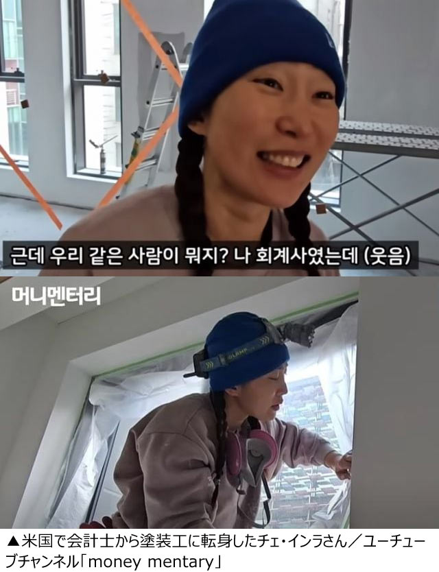ユーチューブチャンネル「money mentary」は先日「名門大学を卒業し、会計士としてある程度認められたがやめてしまい、工事現場で塗装の仕事をしている女性」というタイトルの動画でチェ・インラさんが紹介された。