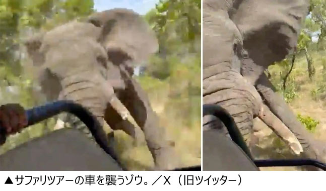 当時の状況が映った動画を見ると、ゾウは遠くから車を目がけて突進してくる。ガイドとみられる人が声を上げて威嚇するが、ゾウは止まることなく駆け寄ってくる。..