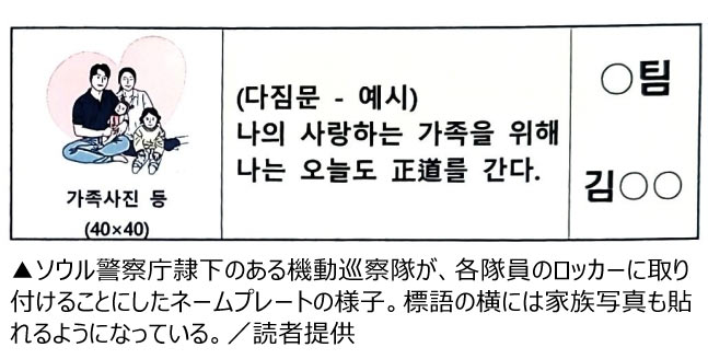 警察によると、ソウルのある機動巡察隊は今月5日、ロッカー用の新しいネームプレートを隊員らに配った。「正道を行く」という趣旨の「誓いの言葉」が記されており、その隣には縦横4センチの大きさの家族写真を貼れるようになっていた。ネームプレートの標語は、内部の討議を経て決められた。