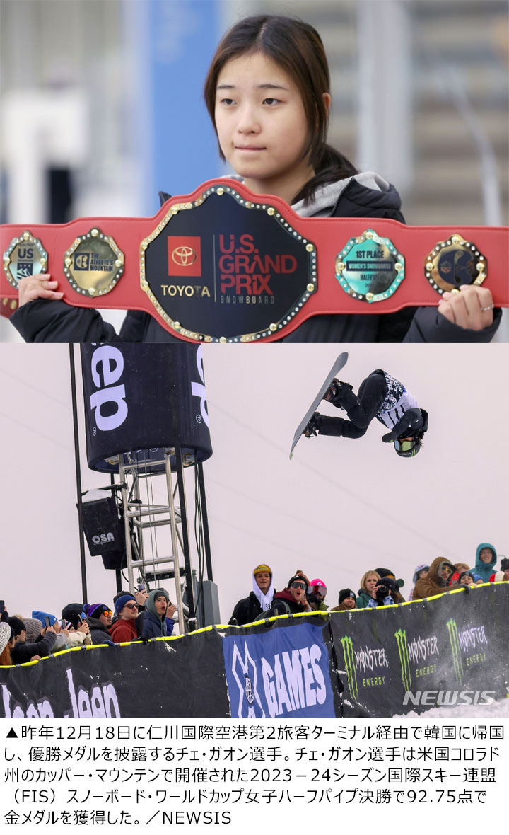 チェ・ガオン選手は昨年12月に米国で開催された2023-24FISスノーボード・ワールドカップ女子ハーフパイプ決勝で92.75点で優勝し金メダルを獲得した。韓国選手としては2人目のFISスノーボード・ワールドカップ優勝だった。