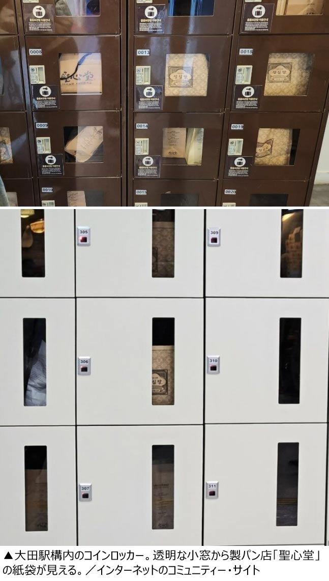 写真を見ると、多数のロッカーに同じデザインの紙袋が入っているのが小窓を通して確認できる。これは、「私の都市、私の聖心堂」「聖心堂は大田の文化です」と書かれた聖心堂の紙袋だ。聖心堂が「大田に来たら訪れるべき名所」「パン地巡礼(有名パン店を巡ること)1位」と言われることから、大田市を訪れた観光客がパンを購入してロッカーに入れたものとみられている。