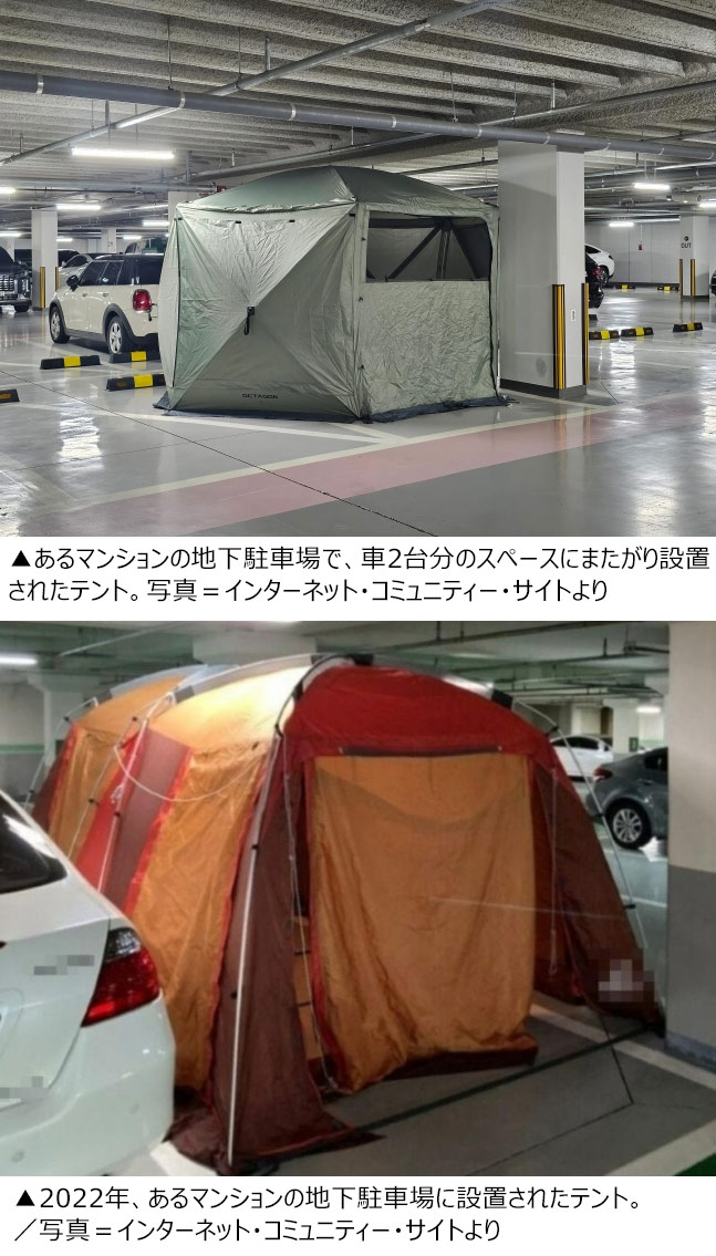 「マンションの地下駐車場にテントが設置されている」という投稿がインターネットであり、共用部分の無断占有に関する問題があらためて注目されている。これまでにもマンションに付設されている児童公園や駐車場などの共用部分にテントが設置され、入居者に不便を強いる事例がネット上で物議を醸してきたが、専門家の間では「単に設置しただけでは法的処罰が難しい」という反応が支配的だった。