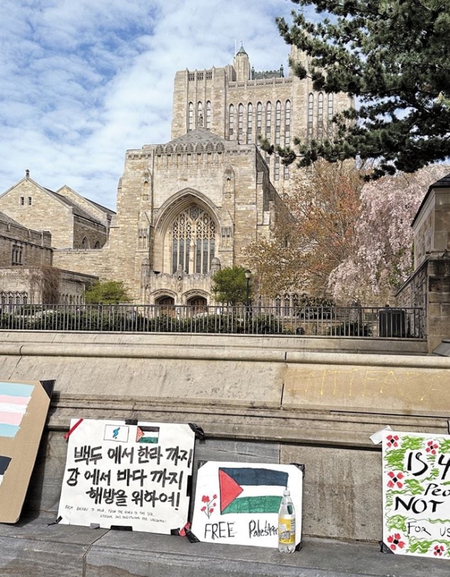 4月28日、コネティカット州にあるイェール大学キャンパスの反イスラエル・デモの現場に行ったとき、記者も類似の経験をした。キャンパスの一角に立てかけてあるプラカードが目に入ったが、そこにはハングルで「白頭から漢拏まで、川から海まで、解放のために!」とハングルで書いてあった。「川から海まで」とは、パレスチナ支持勢力が使うフレーズだ。今回の反イスラエル・デモにおいても使われていた。だが「白頭から漢拏まで」という言葉は、反イスラエルのデモ隊で一般的に使われるものではない。どういう勢力が両者をくっ付けたのか、推測するのは難しくなかった。