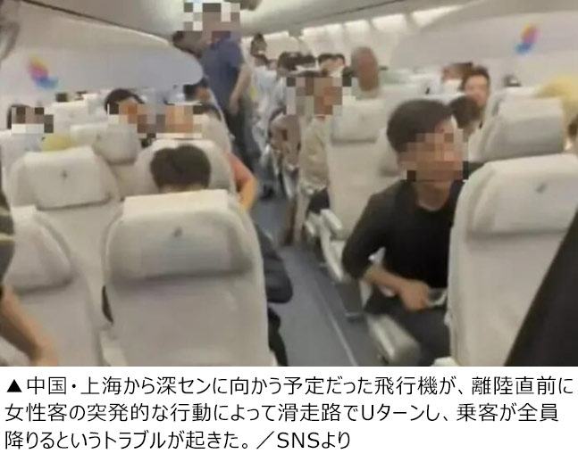 中国・上海から深センに向かう予定だった飛行機が、離陸直前に一人の女性客の突発的な行動によって滑走路でUターンすることになり、乗客が全員降りるという事態になっていたことが分かった。中国の現地メディアが29日、報じた。