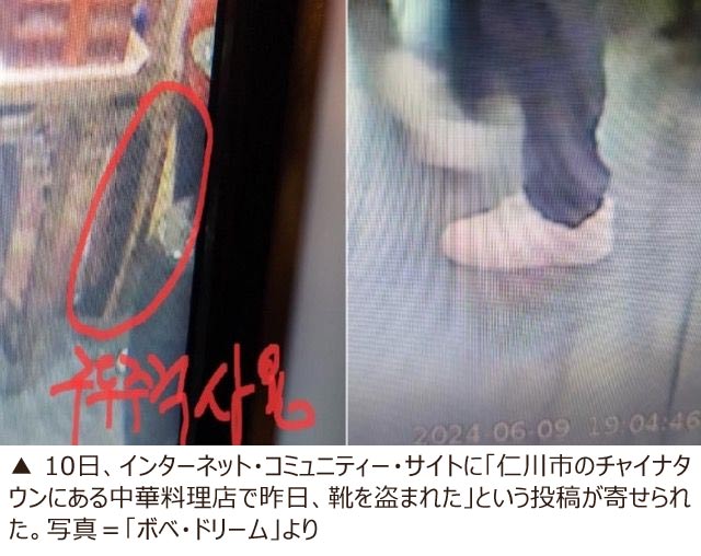 10日、あるインターネット・コミュニティー・サイトに「仁川市のチャイナタウンにある中華料理店で昨日、靴を盗まれた」という投稿があった。