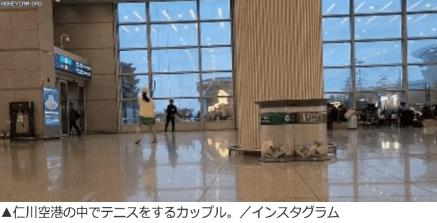 仁川国際空港の中でテニスをするカップルの動画が、インターネット上で拡散されている。
