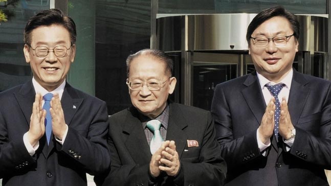 ▲2018年11月、「第1回アジア太平洋の平和・繁栄のための国際大会」に出席するため京畿道を訪問し、当時の李在明(イ・ジェミョン)京畿道知事=写真左=や李華泳(イ・ファヨン)京畿道平和副知事=同右=と記念撮影をする北朝鮮の李種革(リ・ジョンヒョク)朝鮮アジア太平洋平和委員会副委員長=同中央=。写真=聯合ニュース