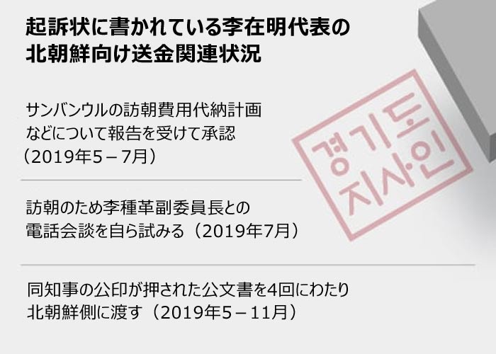 起訴状によると、同年5月からサンバンウルと北朝鮮が訪朝費用の金額をめぐって交渉を行うと、李在明氏側は京畿道知事の公印が押された公文書を数回、北朝鮮(朝鮮アジア太平洋平和委員会員会)に送ったという。これは「経済考察団」という名称で訪朝を希望するので招待してほしい、という内容だったとのことだ。