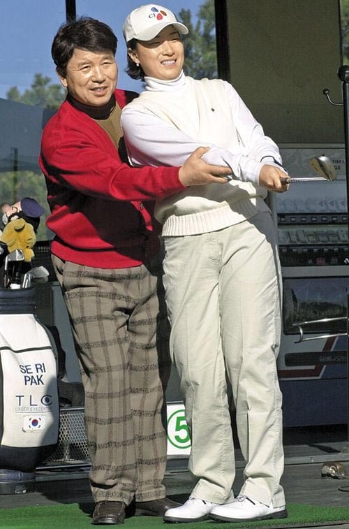 ▲「朴セリ(パク・セリ)希望財団」の朴セリ理事長が現役プロゴルファーだった2003年、父親パク・ジュンチョル氏と一緒に練習する様子。