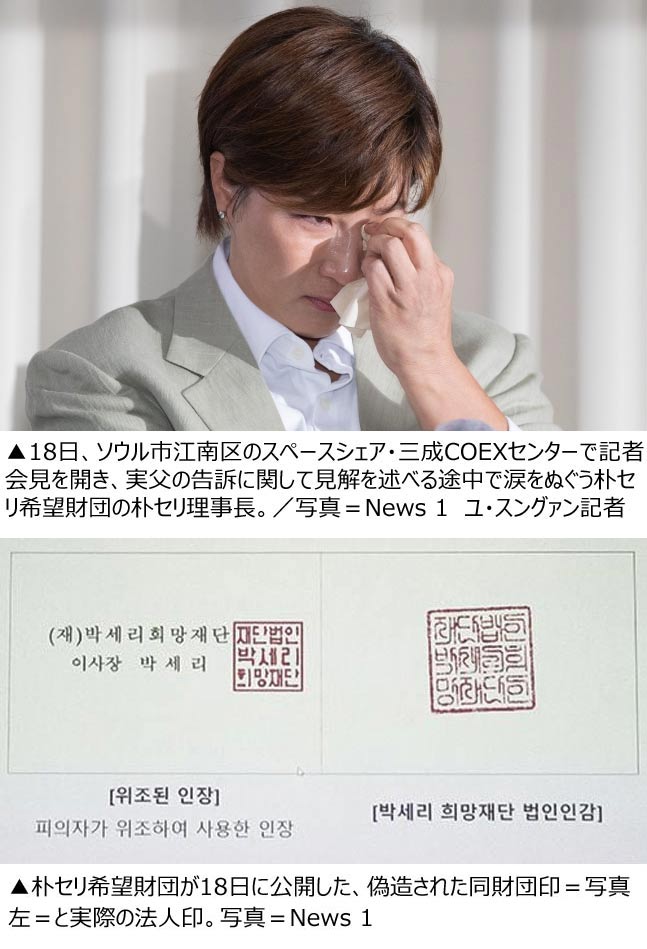 朴セリ理事長は18日、ソウル市江南区のスペースシェア・三成COEXセンターで行った「朴セリ希望財団私文書偽造および偽造私文書行使告訴」に関する記者会見で、「父親の告訴は親子間の確執と関係があるのか」という質問に対し、「全く無関係とは言えない」と答えた。