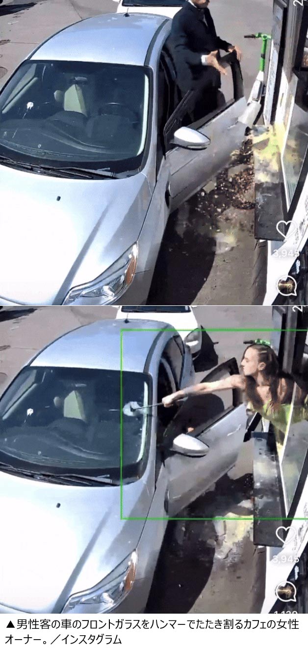 【Photo】コーヒーをぶちまけるドライブスルー客とハンマーでフロントガラスを叩き割る女性オーナー