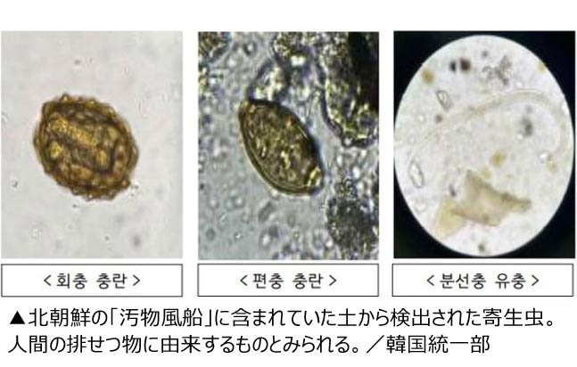 韓国統一部(省に相当)は、24日に発表した「北朝鮮が撒布した汚物の分析結果」で、「北朝鮮が飛ばした汚物風船の内容物を専門機関で分析した結果、汚物に含まれていた土から回虫や鞭虫(べんちゅう)などの寄生虫が多数検出された」と明らかにした。
