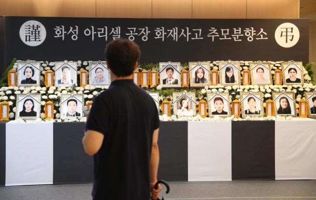 ▲8日午前、京畿道華城市庁のロビーに設けられた「華城アリセル工場火災事故追悼焼香所」の前で足を止める職員。写真=news 1