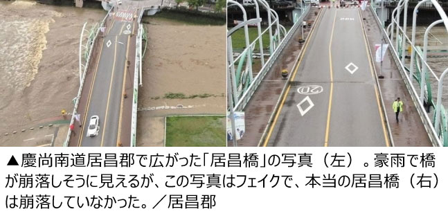 慶尚南道居昌郡で豪雨により橋が崩落しそうに見える写真が広がり、警察が一時車を通行止めにするなどの騒ぎが起こった。しかし実際は橋に問題はなく、この写真は偽物だった。居昌郡は住民を不安に陥れたこの写真の制作者の捜査を警察に依頼した。