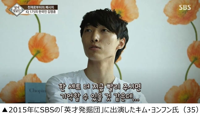 キム氏は2015年にSBS放送「英才発掘団」に出演し、IQ世界3位となり注目を集めた。当時キム氏は無作為で置かれたポーカーのカード2セット(104枚)をわずか10分余りで全て記憶し話題を集めた。キム・ヨンフン氏は現在ノーベル賞受賞者7人を含むハーバード大学、イェール大学、プリンストン大学など世界最高の名門大学教授100人以上が会員となっている世界知能協会(USIA)の設立者兼代表として活動している。