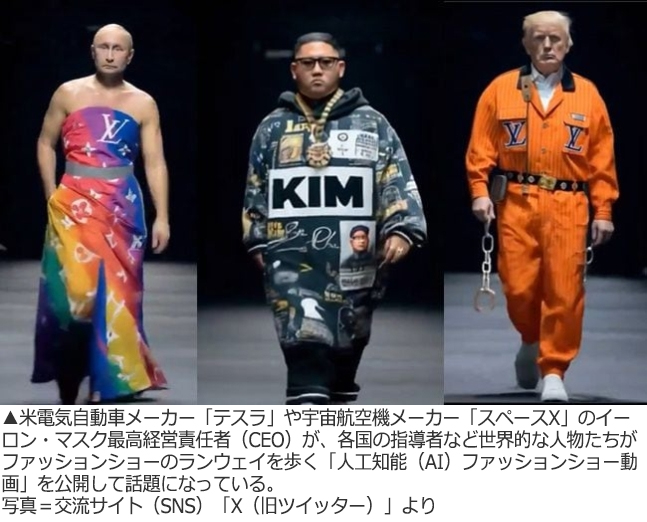 米電気自動車メーカー「テスラ」や宇宙航空機メーカー「スペースX」のイーロン・マスク最高経営責任者(CEO)が、各国の指導者など世界的な人物たちがファッションショーのランウェイを歩く「人工知能(AI)ファッションショー動画」を公開して話題になっている。