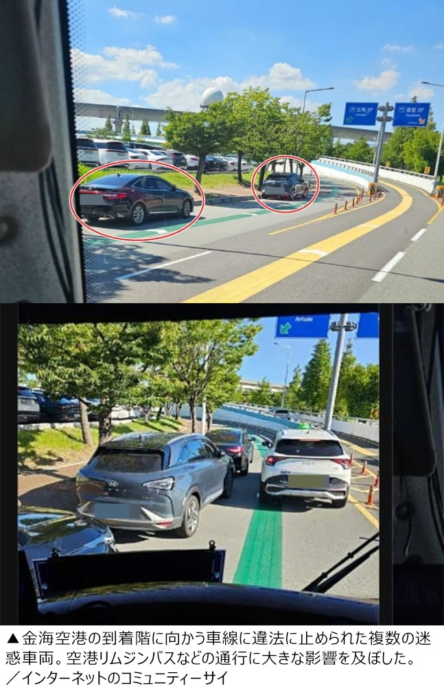 投稿者はこの写真について「非常識な旅行客が、金海空港の駐車場が満車になったため、飛行機の時間が迫っていると言ってあそこに駐車して海外に飛んでいったらしい」として「結局、空港リムジンバスは進入できなかった」と書いた。その後投稿者は、車2台が依然として違法駐車中だとして新たに写真を投稿し「まだそのままだし、レッカー移動もできないって」と説明した。