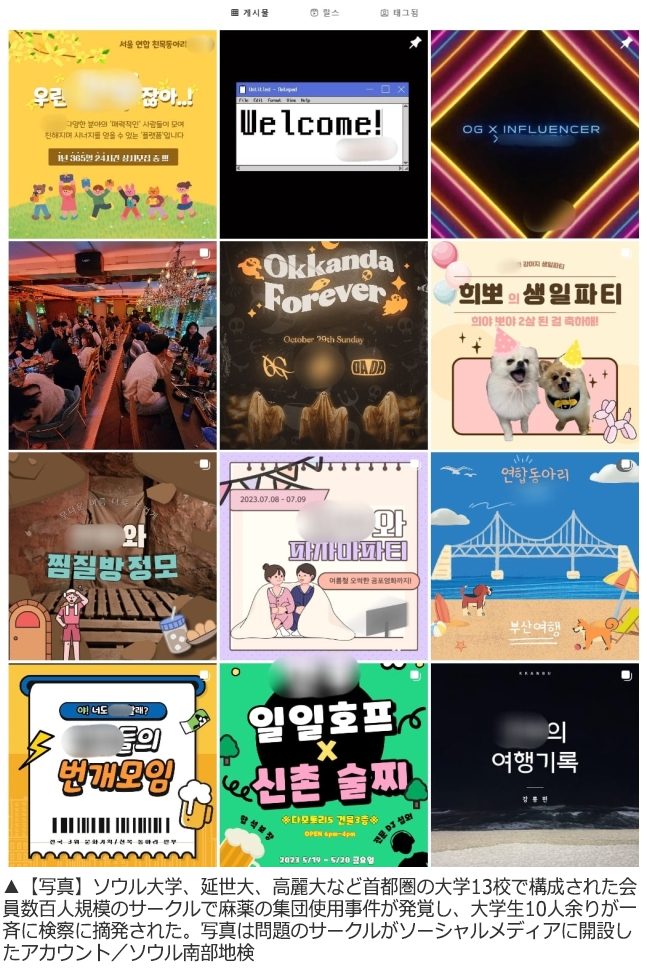 会員の中には名門大の学生だけでなく、医学部や薬学部、法学専門大学院などの受験生も多数含まれているという。サークルはソウル市九老区のマンションを賃借し、「○○ハウス」という名称で事実上の「麻薬アジト」を運営し、法的問題に対応するために顧問弁護士も雇っていたという。
