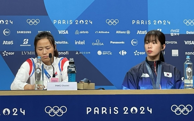 ▲ボクシング女子54キロ級で銅メダルを取った韓国のイム・エジ=写真右=と北朝鮮のパン・チョルミ=同左=。9日(韓国時間)、フランス・パリでそろって記者会見をした。写真=聯合ニュース
