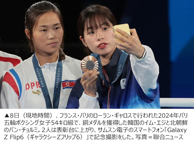 【TV朝鮮】(アンカー)パリ五輪ボクシング女子53キロ級の韓国代表イム・エジ選手と北朝鮮代表パン・チョルミ選手がそろって銅メダルを取り、授賞式と記者会見で一緒になりました。パン・チョルミ選手は終始、硬い表情をしていましたが、イム・エジ選手のユーモラスな一言で笑顔を見せました。今回のパリ五輪で北朝鮮の選手たちは韓国の選手たちとの接触を歓迎していないように見えただけに、異例のことでした。ク・ミンソン..