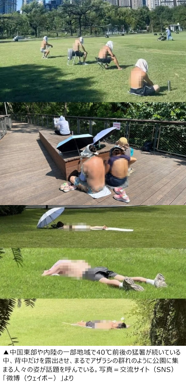 【NEWSIS】中国東部や内陸の一部地域で40℃前後の猛暑が続いている中、背中だけを露出させ、まるでアザラシの群れのように公園に集まる人々の姿が話題を呼んでいる。