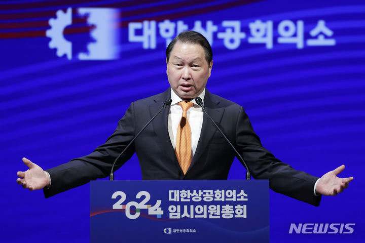 ▲大韓商工会議所会長も務めている崔泰源(チェ・テウォン)SKグループ会長(2024年3月21日撮影)。