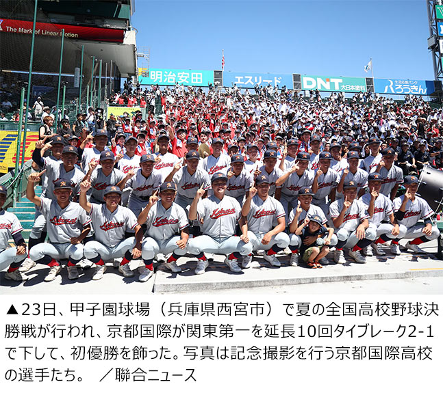 かつて在日韓国人向けの民族学校だった京都国際高校が初めて日本全国高等学校野球選手権大会(夏の甲子園大会)で頂点に立った。23日、甲子園球場で夏の全国高校野球決勝戦が行われ、京都国際が関東第一を延長10回タイブレーク2-1で下して、初優勝を飾った。決勝戦での延長タイブレーク突入は史上初だった。