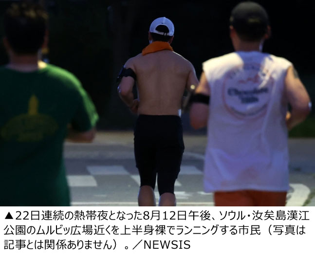 史上最悪の記録的な猛暑となった今年の夏、河川敷や公園で上半身裸になって運動する人が増え、ソウル市などに苦情が相次いでいる。ソウル市未来漢江本部の関係者は「公序良俗に反するとの理由で苦情が続いている」として「漢江公園をパトロールする際に『服を着てほしい』と口頭で呼び掛けている」と説明した。警察の関係者は「今年4月以降、上半身の服を脱ぐことに関する苦情が毎日10件前後寄せられている」「最近では苦情が絶えないため、周期的に取り締まりを行っている」と話した。