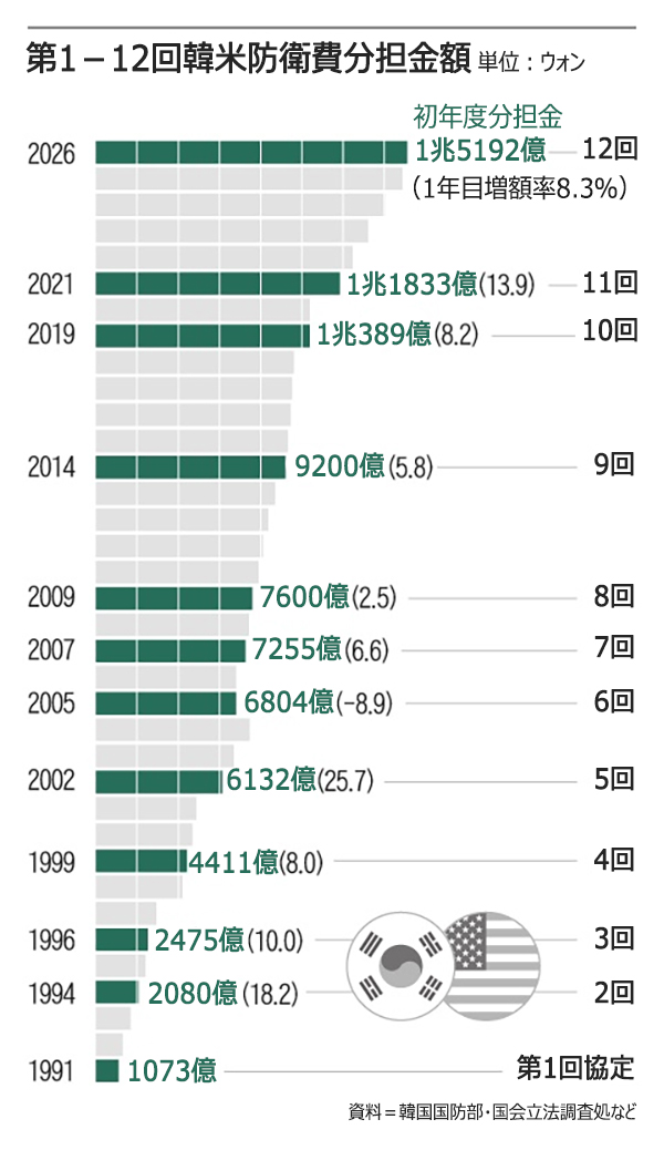 2026年以降に韓国が負担する在韓米軍防衛費分担金交渉が4日に妥結した。韓国外交部(省に相当、以下同じ)が同日発表した。それによると今年4月の第12回韓米防衛費分担特別協定(SMA)を皮切りに8回の交渉を重ねた結果、2026年の分担金を2025年よりも8.3%多い総額1兆5192億ウォン(約1676億円)とすることが決まった。今回決まった第12回SMAは2026-2030の5年間適用される。