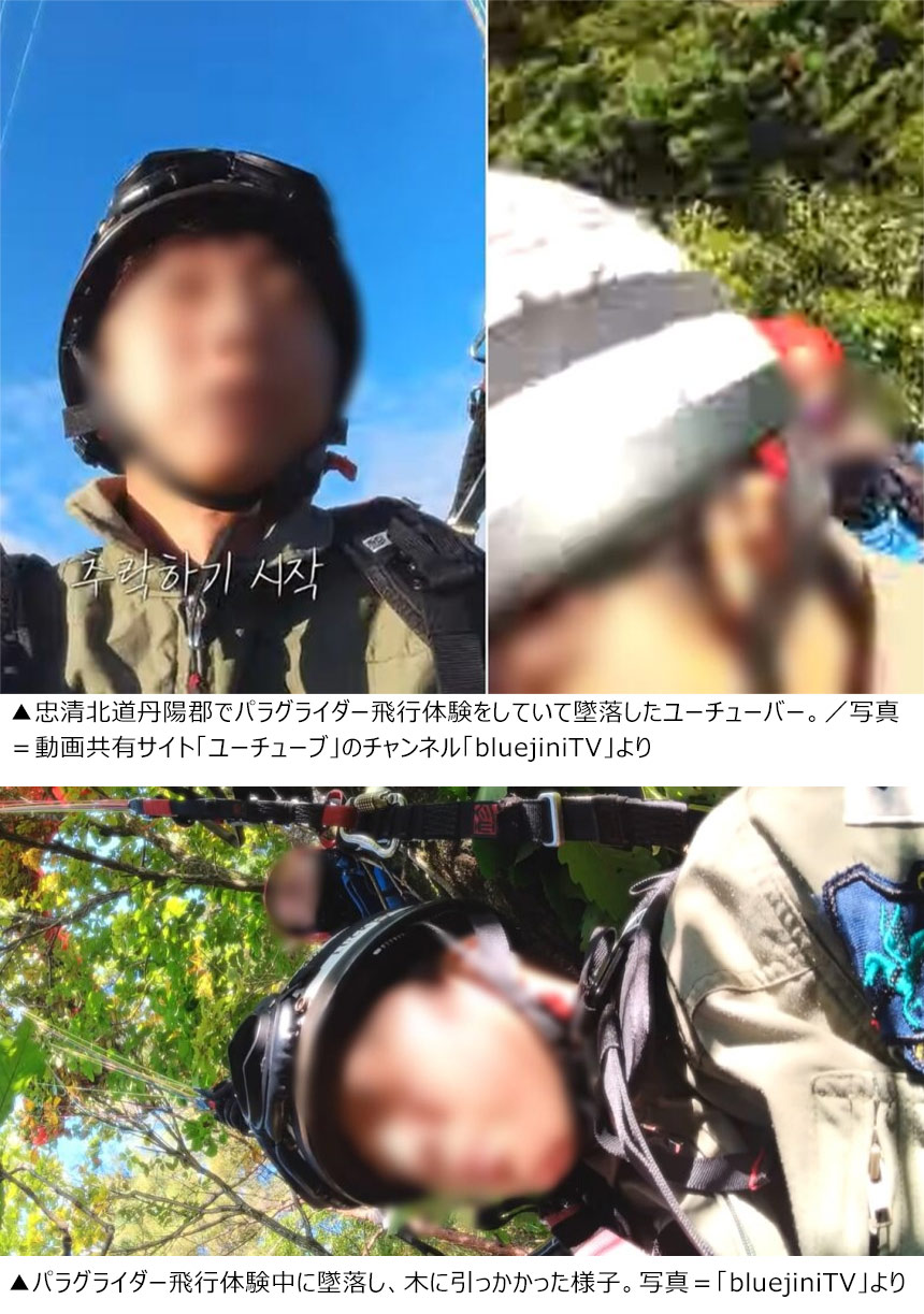 パラグライダー飛行の有名スポットとなっている忠清北道丹陽郡で飛行体験中に墜落事故に遭ったユーチューバーが動画共有サイト「ユーチューブ」のチャンネルに動画をアップロードした。