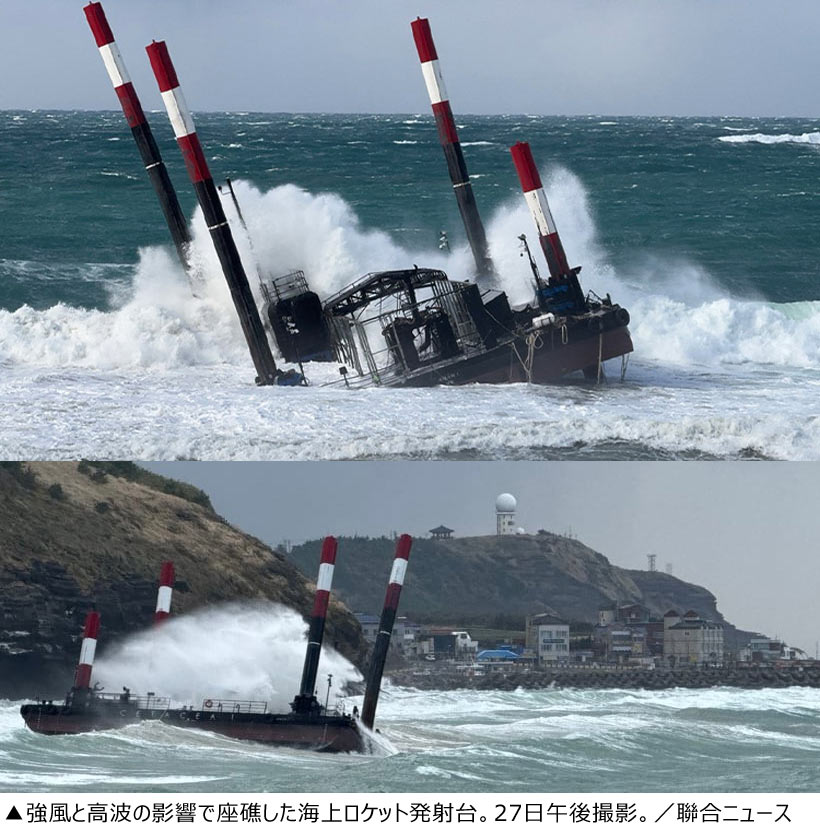 済州島沖の海上に設置されていたバージ(はしけ)型のロケット発射台が、強風と高波の影響で座礁したことが分かった。