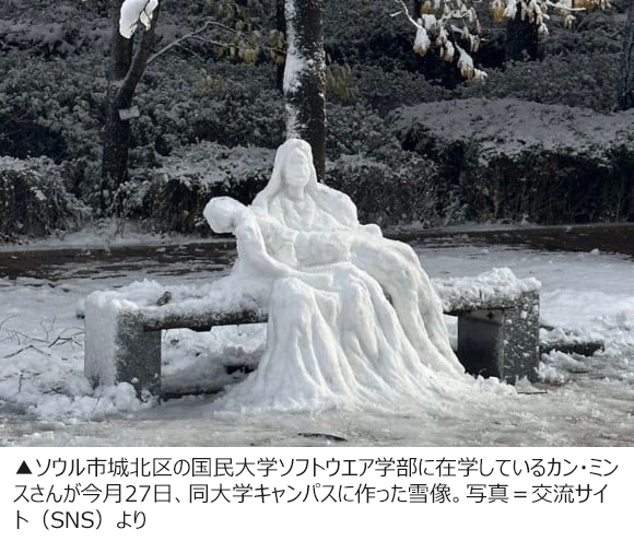 大雪が降り始めた28日、ソウル市城北区の国民大学美術学部前のベンチに、学生が作ったと推定される雪像が現れた。複数のSNS上で公開された雪像の写真を見ると、バチカンのサンピエトロ大聖堂にあるミケランジェロ作の「ピエタ」像に似ている。イエス・キリストが十字架にはり付けられて死んだ後、聖母マリアの膝の上に横たわる姿を描写したルネサンス時代の代表作の一つだ。