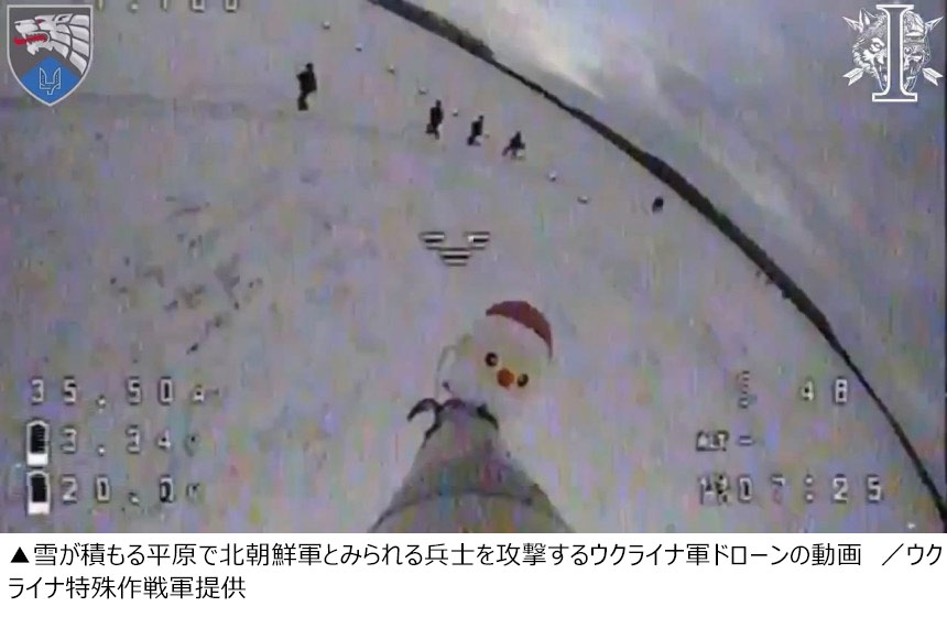 同チャンネルに掲載された1分7秒の動画には、ウクライナ軍のドローンが北朝鮮軍とみられる兵士らに20発以上の爆撃を加える様子が映っていた。動画には雪が積もる平原を進んでいた時にドローン攻撃を受けた兵士、ドローン攻撃から逃れるため走り去る複数の兵士、木の後ろに隠れるが最後まで追跡するドローンに攻撃を受ける兵士、別の兵士の遺体を運ぶ兵士らの姿などが映っていた。