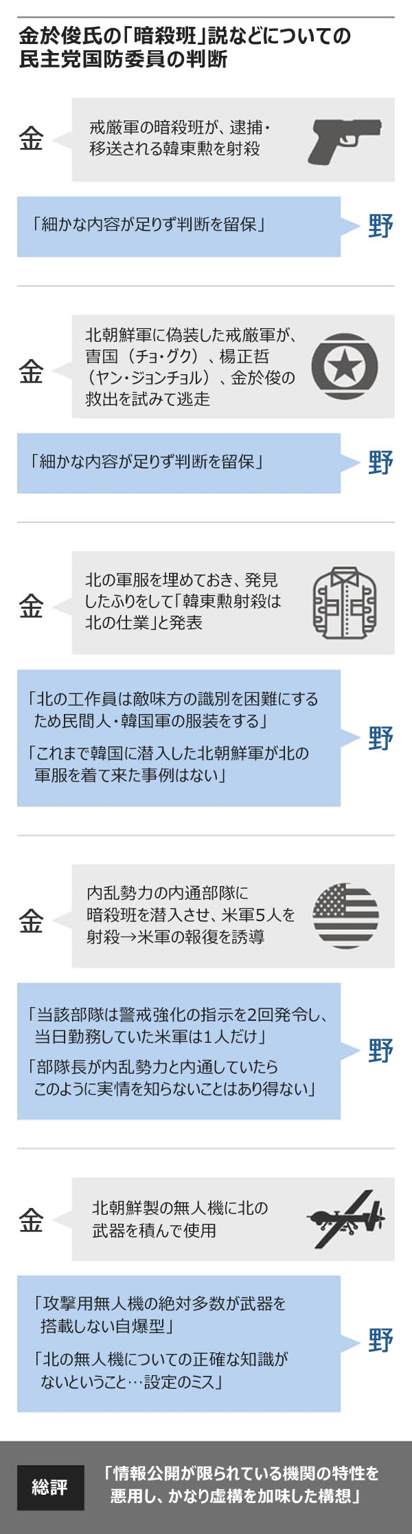 民主党の国防委報告書は、根拠を提示しない一方的主張に対して一線を画した、という意味がある。同報告書は「韓東勲暗殺班」について「軍事情報機関について過去の限られた知識を持つ人物が、情報公開が制限されている特性を悪用した」とし「情報司(国軍情報司令部)エージェントの戒厳加担という一部の事実を基に虚構を加味した」という見方を示した。この話はうそ、という意味だ。