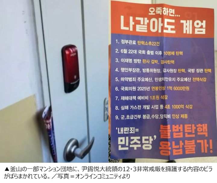 【ソウル=NEWSIS】釜山の一部マンション団地に、尹錫悦(ユン・ソンニョル)大統領の12・3非常戒厳を擁護する内容のビラがばらまかれた。