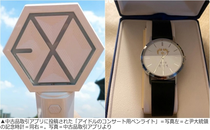【写真】中古品サイトに出品された「アイドルのコンサート用ペンライト」と尹大統領の記念時計