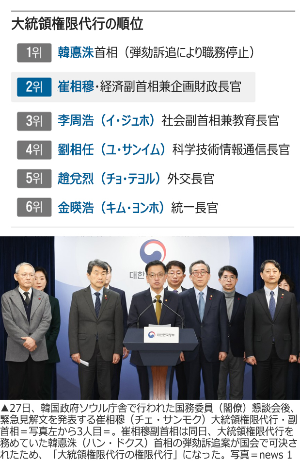 韓国最大野党・共に民主党は27日、韓悳洙(ハン・ドクス)首相の職務停止により大統領権限代行職を継承した崔相穆(チェ・サンモク)経済副首相兼企画財政長官に対し、「国会推薦の憲法裁判官3人を任命せよ」と要求した。同党は「我々が要求してきた憲法裁判官の任命などを崔相穆副首相が受け入れなければ、また弾劾訴追を推進する」と言った。同党は政府組織法に基づき、大統領権限代行職を継承する他の国務委員(閣僚)に対しても弾劾訴追を予告するなど、行政府の崩壊も辞さない構えだ。