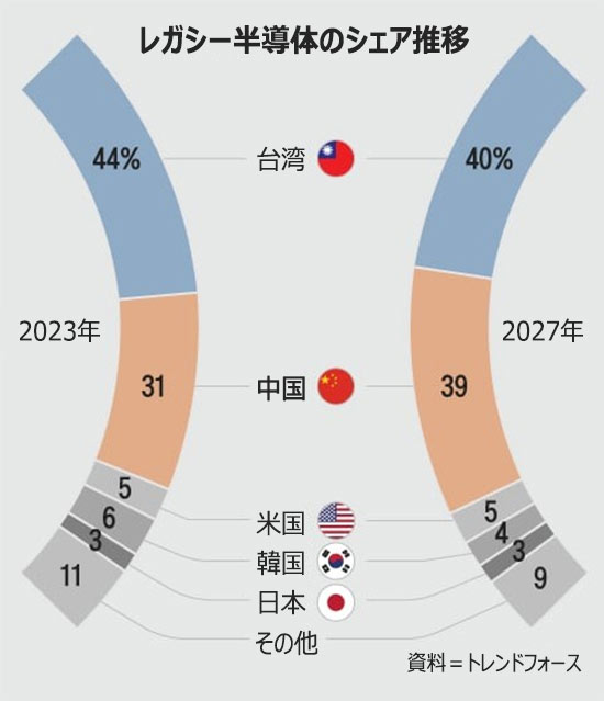 家電製品などに使われるシステム半導体やパソコン用DRAMなどのレガシー半導体市場で中国のシェアは最近急激に上昇している。市場調査会社トレンドフォースによると、中国のレガシー半導体シェアは2023年の31%から2027年には39%へと主要国の中で唯一上昇が見込まれている。