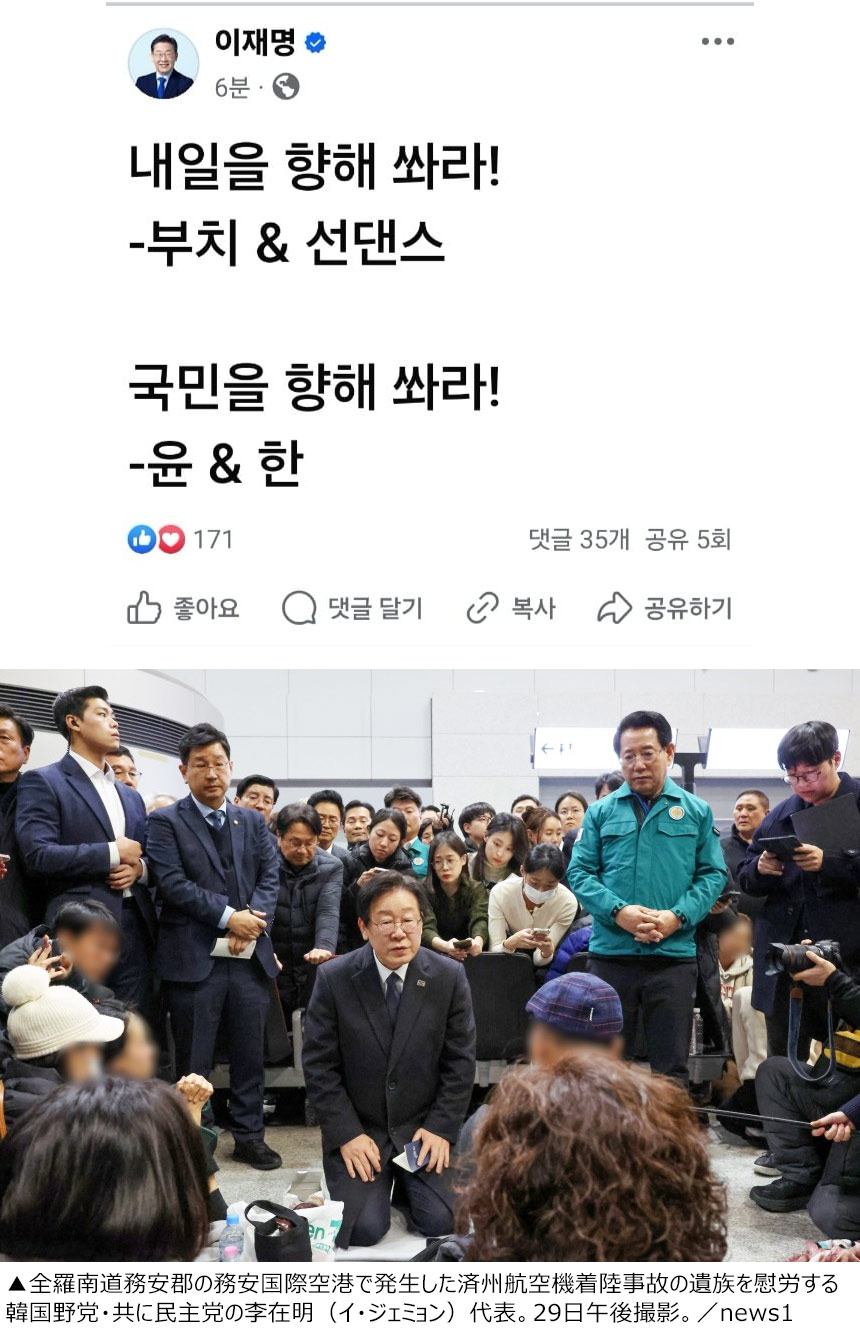 全羅南道務安郡の務安国際空港で発生した済州航空旅客機事故で多くの死傷者が出た直後、韓国野党・共に民主党の李在明(イ・ジェミョン)代表は自らのフェイスブックに尹錫悦(ユン・ソンニョル)大統領を風刺する投稿を行った。これに対して与党・国民の力は29日「国民と安全については何も考えていないのか」と強く批判した。