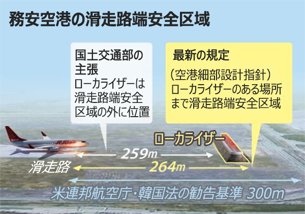 務安空港のローカライザーとコンクリート構造物は滑走路から264メートル離れた場所に設置されていた。この構造物について国土交通部は「航空機のオーバーラン(離着陸の際に滑走路から外れる現象)などに備えて設置された『滑走路端安全区域』の外にあるため規定に反しない」と説明してきた。滑走路端安全区域の外にある構造物は空港施設規定の適用を受けないからだ。