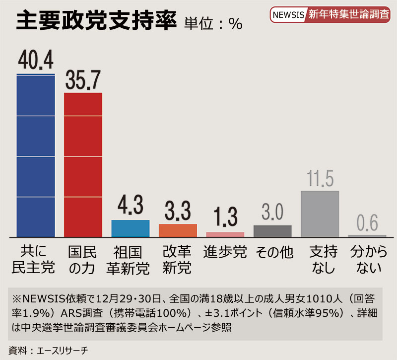 エースリサーチがNEWSISの依頼に基づいて12月29日・30日の両日、満18歳以上の成人1010人を対象に支持政党調査を行ったところ、共に民主党が40.4%、国民の力が35.7%を記録した。
