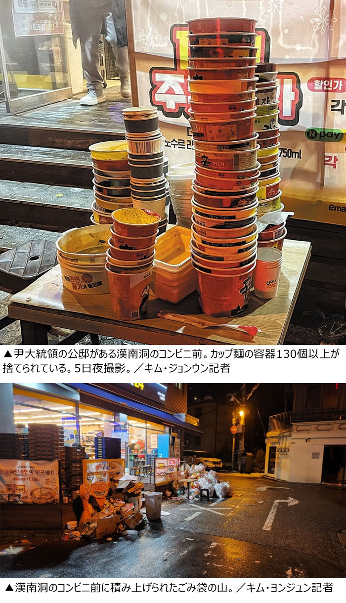 今月5日夜、尹錫悦(ユン・ソンニョル)大統領の弾劾賛成派・反対派双方による集会が開かれていたソウル市竜山区漢南洞。近くのコンビニエンスストアには、カップ麺の容器が数十個、高さ1メートル近く積み上げられていた。さらに、20個以上のごみ袋がコンビニの入り口にうず高く積まれており、段ボール箱とカップ麺の容器が散らばっていた。