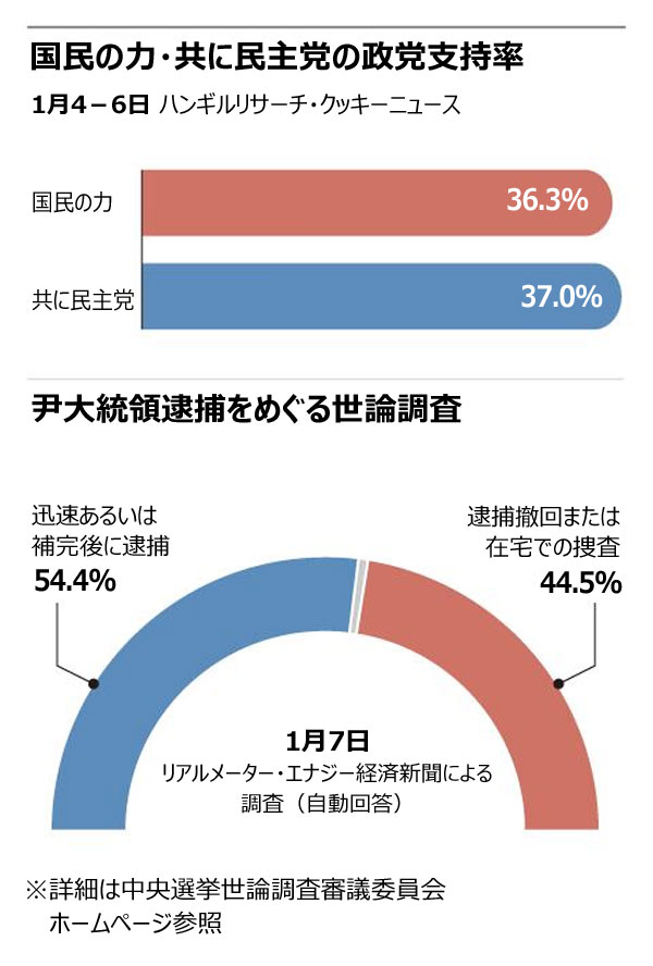 尹大統領が公捜処の召喚や逮捕状執行に応じないことも、これら一連の流れを意識したとの見方もある。しかし「議題と戦略グループ:ザ・モア」のユン・テゴン政治分析室長は「世論調査の過程で保守層の回答者がオーバーサンプリングされた可能性もあるので、国民の力支持率上昇が中道層や無党派層からの支持につながるとは断言できない」と慎重な見方を示している。
